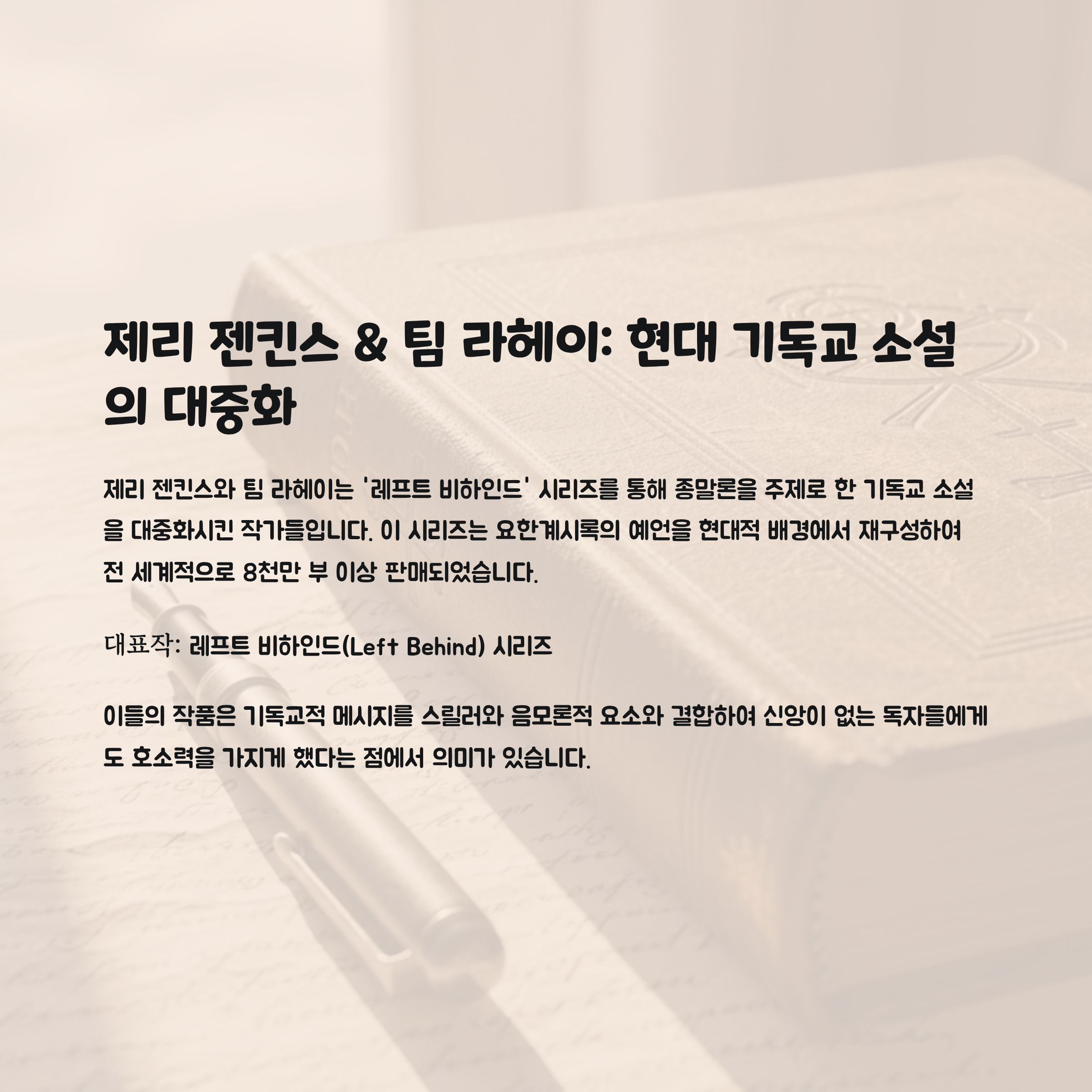특징: 종말론적 세계관을 기반으로 한 스릴러 스타일의 기독교 소설. 현대 기독교 소설의 대중화를 이끈 작품.