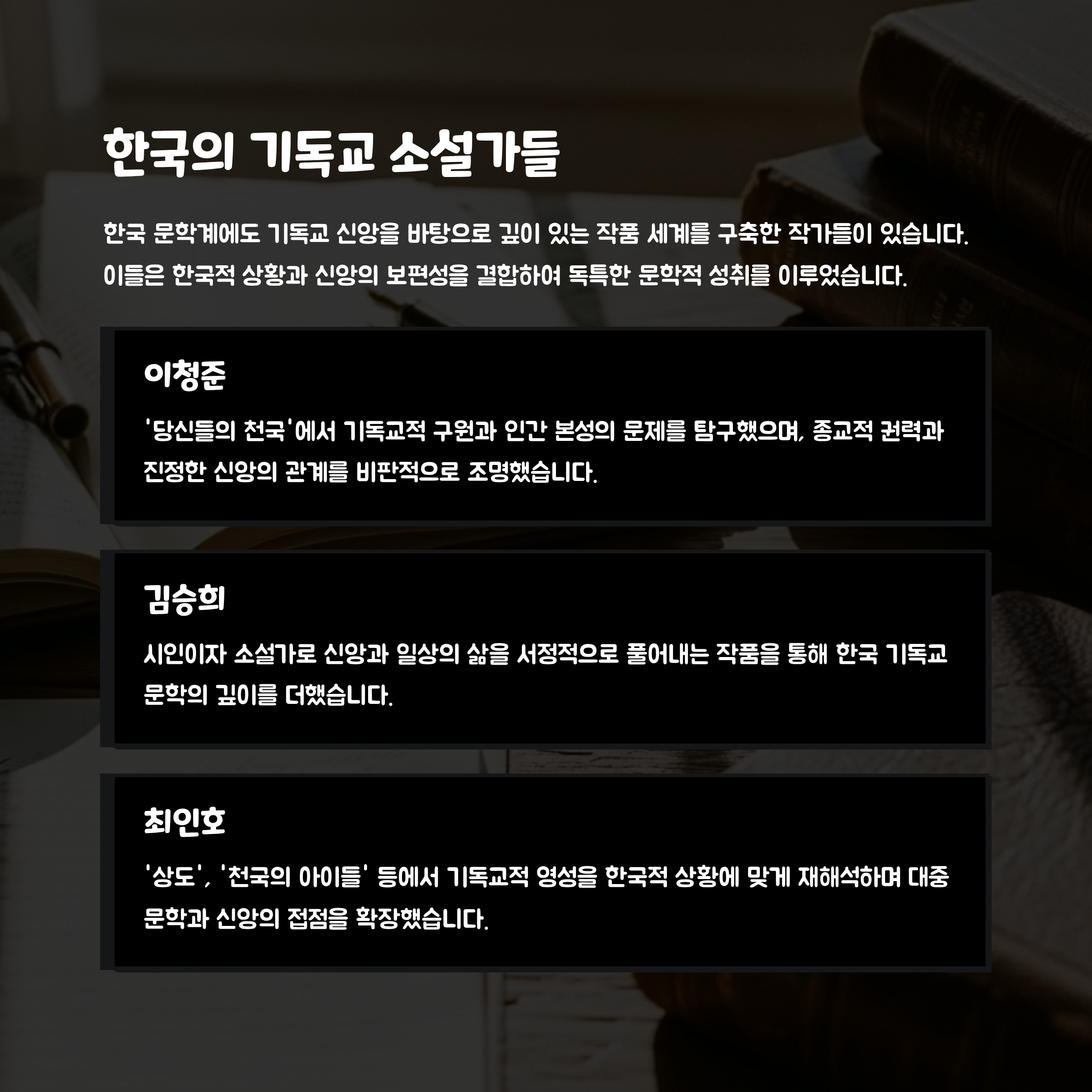 최인호: 상도, 천국의 아이들 등에서 기독교적 영성을 담은 이야기 전개.