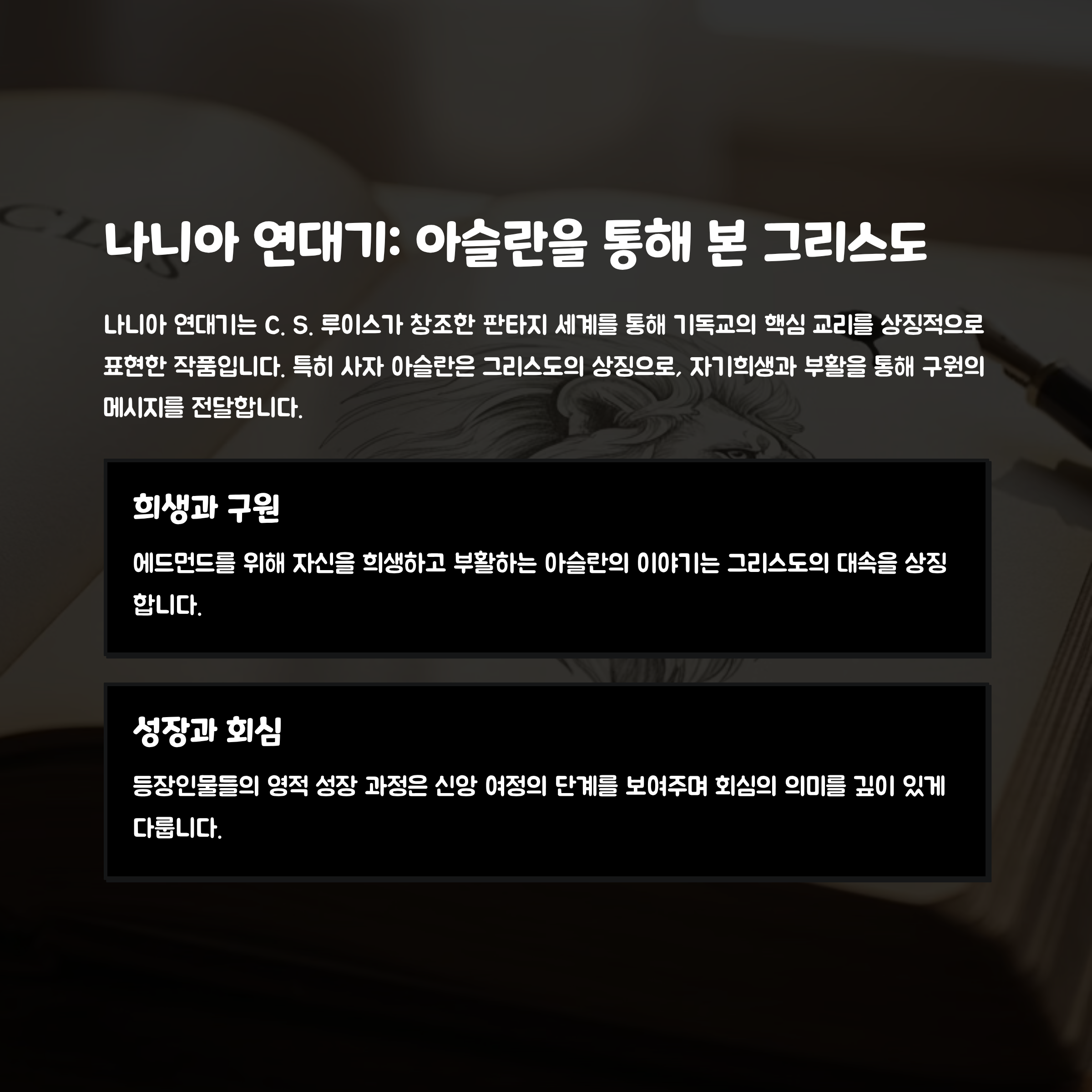 특징: 판타지와 기독교 신앙을 결합해 복음 메시지를 쉽고 상징적으로 전달. 어린이뿐만 아니라 성인 독자들에게도 깊은 영적 의미를 제공.