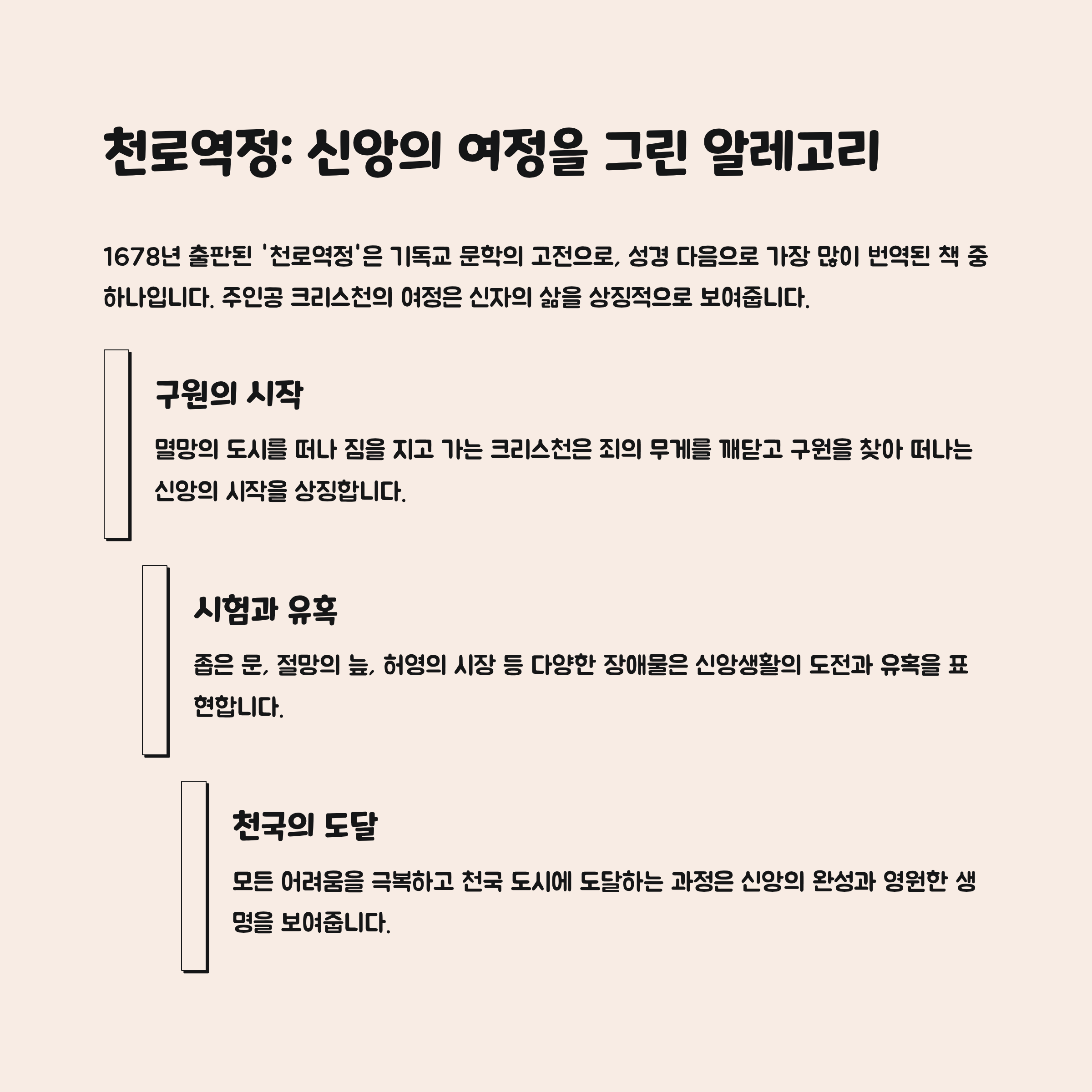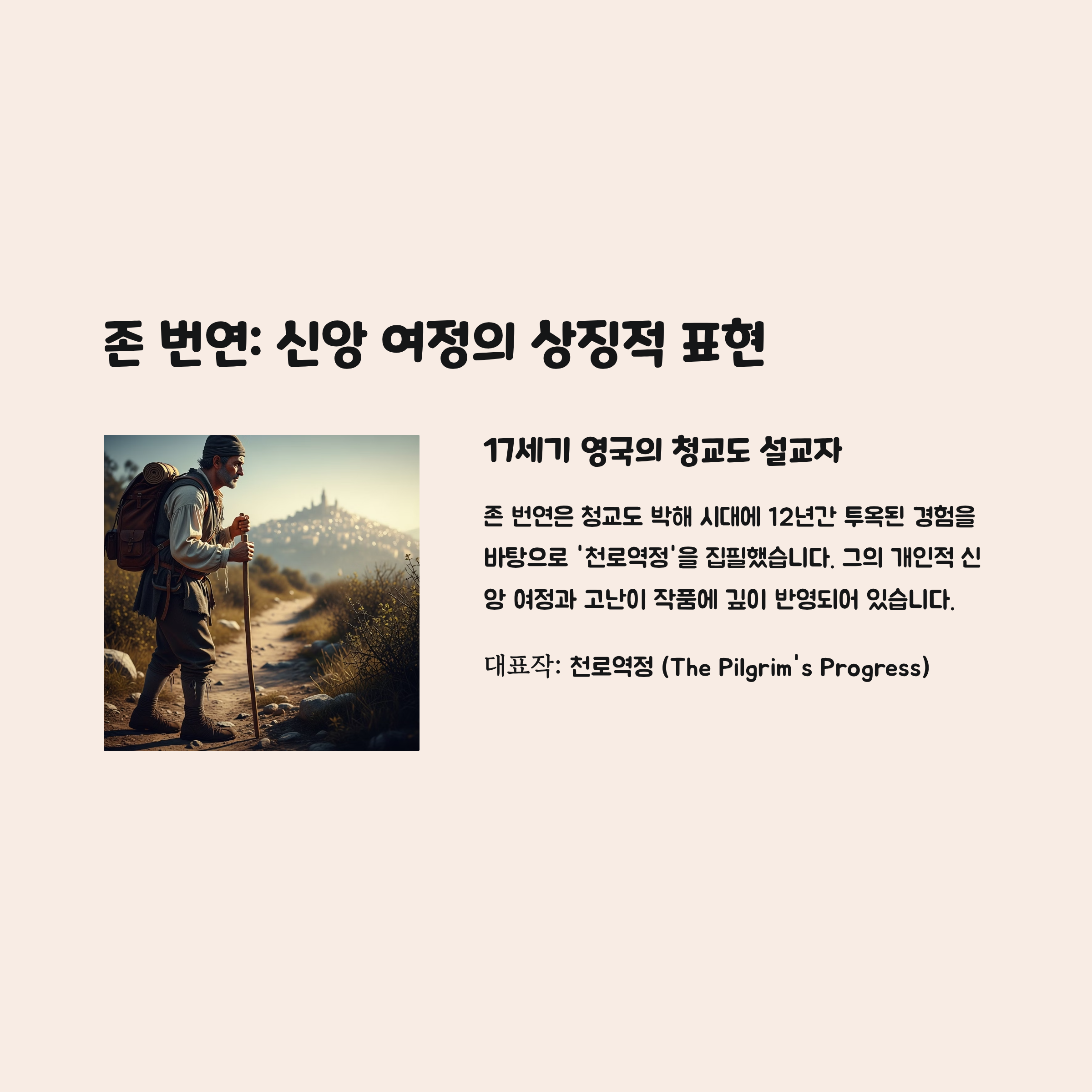 특징: 기독교 문학의 고전으로 평가되며, 신앙의 여정을 알legory로 표현. 전 세계적으로 가장 많이 번역된 책 중 하나.