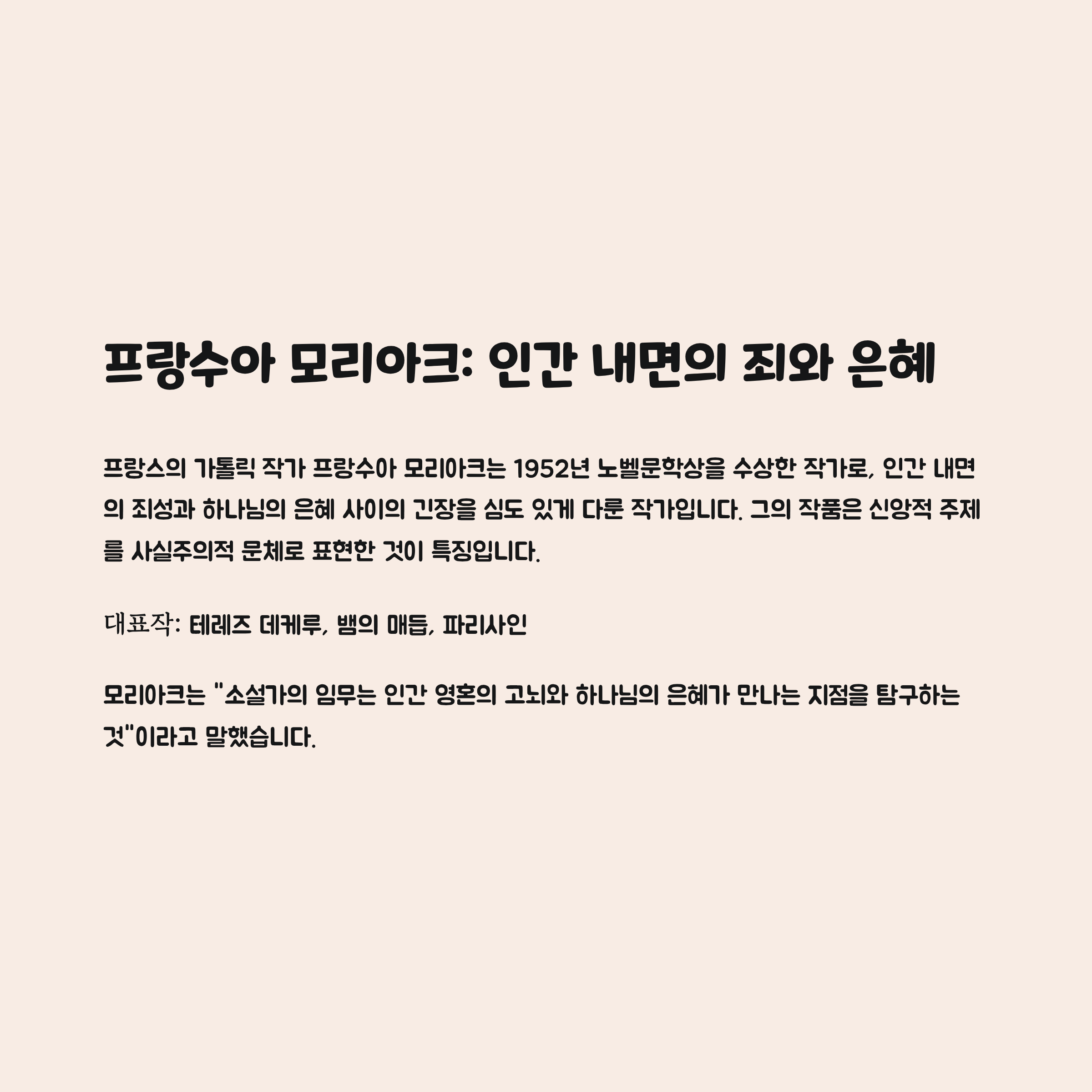 특징: 프랑스의 가톨릭 작가로 인간 내면의 죄성과 구원, 은혜의 주제를 사실적으로 묘사. 노벨문학상 수상자.