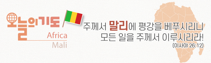 1. 말리가 가난하나 정치는 안정되어 있었고, 인구의 87% 이상이 이슬람교인 무슬림 국가인데도 어느 정도 온건하여서 종교의 자유를 보장하는 세속국가이었다. 그러나 2012년 쿠데타 이후 알카에다가 북쪽 사막 지역을 장악하여 모든 학교를 폐쇄하고 이슬람 교육만 하는 심각한 상황이 되었다. 그들은 중부까지 내려와 위협하며 테러와 외국인 납치를 일삼고 있다. 2020년의 쿠데타로 군사정권이 계속 통치하고 있으며, 나라 전체 행정의 마비, 공교육이 멈춘 상태이다. 말리를 다스리시는 하나님께 알카에다, 군사 정권들, 이슬람교 등 다른 주들이 말리를 관할하고 있으나, 우리는 주만 의지하고 주의 이름을 부르며 위기에서 건지시길 간구하자.