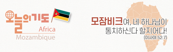 교회들과 선교사들이 모잠비크의 미전도 종족에게 더욱 활발히 복음을 전하도록 기도하자. 그리하여 ‘내 백성은 내 이름을 알리라 그러므로 그 날에는 그들이 이 말을 하는 자가 나인 줄을 알리라 내가 여기 있느니라’하신 말씀이 각 종족에게 이루어지도록 기도하자.