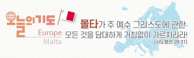 난파된 바울과 일행을 영접하여 은혜를 입은 보블리오를 통해 그 섬의 또 다른 병든 사람이 고침을 받았던 것처럼 몰타인들이 주님의 긍휼로 나그네를 섬길 수 있도록 기도하자. 그리하여 몰타에 있는 여러 민족이 예수 그리스도의 복음으로 구원받아 하나님께 영광을 돌리는 나라가 되도록 기도하자.