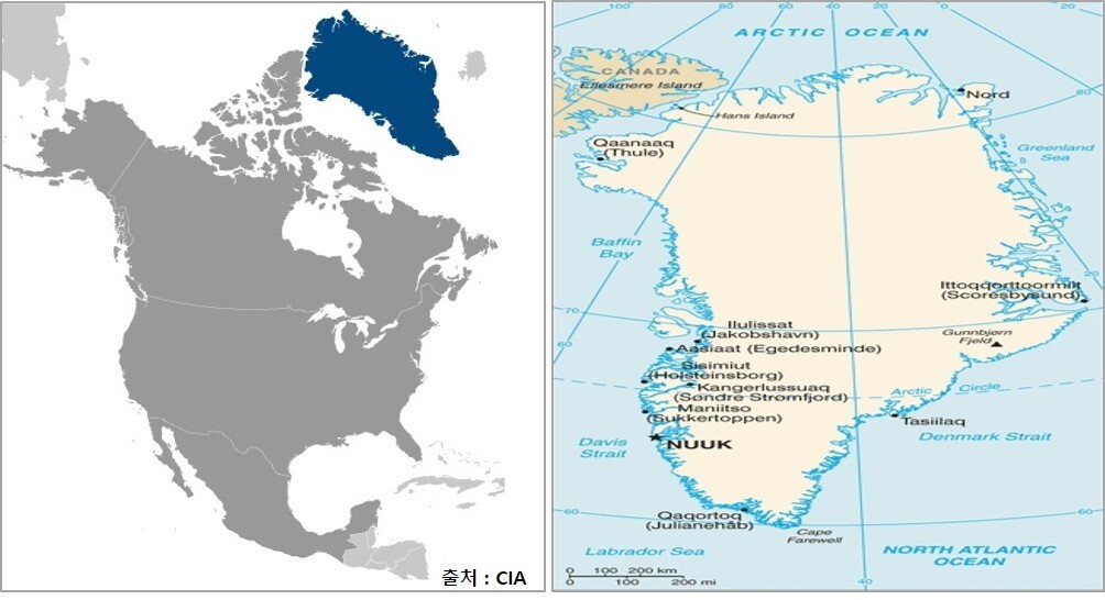 면적 l 2,166,086㎢(한국의 22배) 북아메리카 북동부 대서양과 북극해 사이에 세계에 최대의 큰 섬. 국토의 85%가 빙하로 덮임.