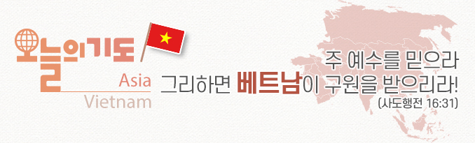 주님의 방법과 지혜로 외국 선교사들과 베트남 교회 사역자들이 연합하여 전국에 복음을 전하고 제자로 가르치며 양육할 수 있도록 기도하자. 복음의 증인들이 세워져 ‘주 예수를 믿으라 그리하면 너와 네 집이 구원을 받으리라!’ 말씀이 베트남에 이루어지기를 간구하자.