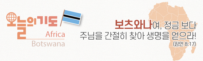 보츠와나 교회의 목회자와 지도자들, 명목상 신자들이 자신들의 삶을 정직하게 진리에 비추어보아서 훈계를 받도록 기도하자. 그래서 은보다 정금보다 더욱 귀한 삶을 변화시키는 복음을 향한 간절한 목마름을 주셔서 영원한 생명과 거룩한 존재로 거듭나도록 기도하자.