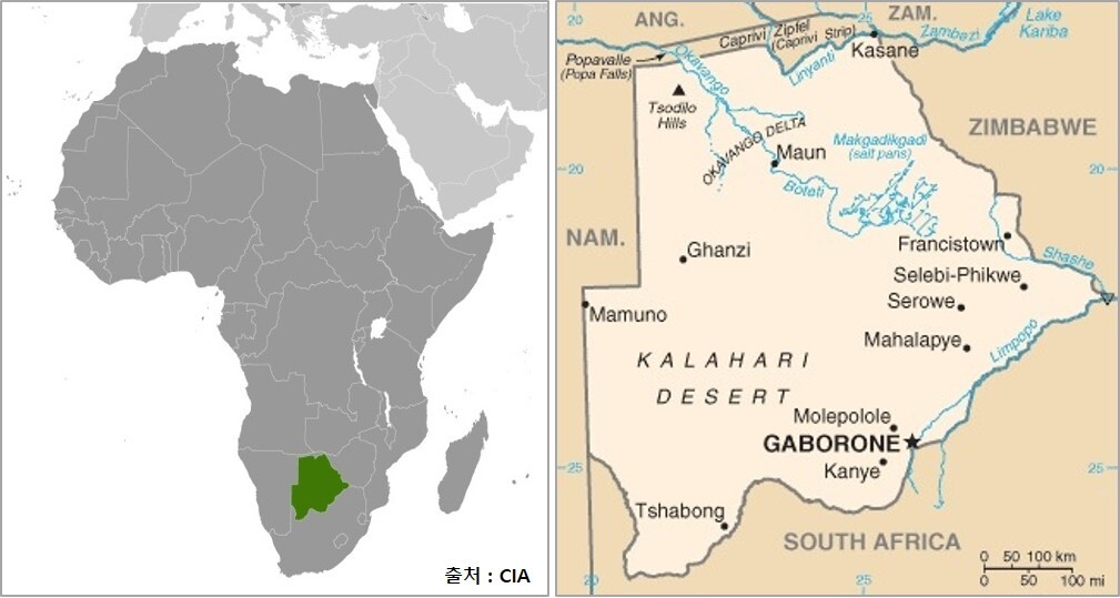 면적 l 581,730㎢(한국의 6배) 아프리카 남부 중앙 내륙에 칼라하리 사막이 국토의 80%를 차지.