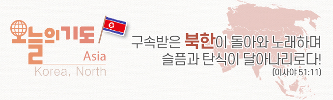 3. 북한의 2천5백만 명이 복음을 들어야 할 미전도종족이다. 나라의 문을 굳게 닫고 핵과 대량살상무기를 의지하여 살아남기 위해 발버둥치는 북한에 하나님의 공의가 가깝고 만민을 심판하실 때가 가까이 왔음을 알게 하시도록 기도하자. 자신들의 힘으로 독재를 유지하며 무너지지 않으려 하는 김정은 정권의 교만을 꺾으시고 복음의 능력으로 폭정이 그쳐지도록 기도하자.