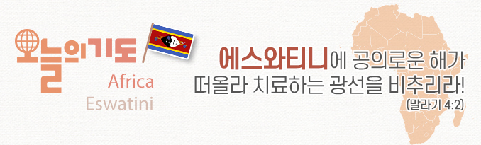 3. 2018년 유엔 통계에 의하면 최대 22만 명 이상이 에이즈에 걸렸다. 15세 이상 여성의 경우 1/3이 에이즈 환자이며, 평균 수명이 한때 32세로 내려간 적이 있었다. 에이즈로 사망하는 젊은 성인 인구가 늘어나 노동 계층이 사라지고 있으며, 약 10만 명 정도의 많은 아이가 부모를 잃어 고아들로 가난하고 힘들게 살아가고 있다. 기독교인의 성적 윤리 부족과 난잡한 성행위, 일부다처제 풍습으로 에이즈가 수그러들지 않고 있다. 이들을 섬길 교회, 병원과 보건 기관들을 세워주셔서 치료의 광선이 몸과 마음에 비추어지도록 기도하자. 에이즈 환자들에게 복음이 계속 전해지고 성 윤리가 성경으로 거룩하여져서 근본적으로 변화되도록 기도하자.