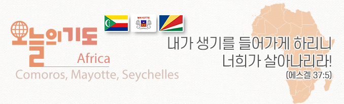 코모로가 아주 말라버린 뼈들처럼 영적으로 죽어있을지라도, 하나님의 권능이 임하셔서 말씀하시면 능히 구원과 부흥이 일어날 수 있음을 믿음으로 선포하자. 수천 명의 숨은 신자들이 가족과 공동체의 보복과 박해를 받고 있지만 믿음을 굳건히 지켜가게 하시고, 그들을 보호하여 기도하게 하셔서 담대히 복음을 증거 하도록 기도하자.