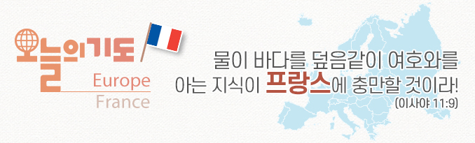 프랑스 개신교가 위그노 선조들의 순교 역사 위에 세워졌지만, 이후 무신론적인 물질주의와 실존주의에 빠졌다. 더욱 인본주의, 명목주의 신자가 되어 지금은 인구의 2%이며 복음주의는 1.2%인 84만 명밖에 되지 않는다. 세속적 무신론이 팽배한 프랑스에 세상과 구별된 복음의 진리로 굳게 선 교회를 일으켜 주시도록 기도하자. 교회의 복음 전파와 기도를 통해 이 땅에 물이 바다 덮음같이 여호와를 아는 지식이 충만한 그 날을 주시도록 기도하자.