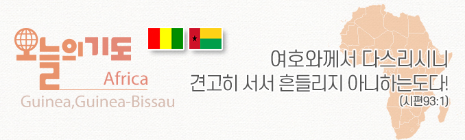 1. 기니는 인구의 88%가 무슬림인 이슬람 국가이지만, 이전에 공산주의 무슬림 과격단체에서 수년 동안 자행한 테러에 대한 반발로 종교의 자유가 허용되었고, 이로 인해 무슬림 개종자들이 점점 늘어나게 하심에 감사하자. 그러나 기독교는 인구의 4%를 조금 넘은 상황이고, 복음주의자들은 1%도 되지 않은 9만여 명의 소수이다. 기독교인들은 수도 코나크리와 남부 삼림 지대에, 주로 키시족, 크펠레족, 토마족이 많이 살고있는 지역에 분포한다. 기독교 선교사 연맹(CMA) 등과 연계해서 복음주의 개신교 교단(EPEG)에 여러 교단과 교회가 속해 있다. 기니에는 3개의 성경학교가 있고, 평신도 지도자 훈련학교, 신학연장교육(TEE) 등을 통해 목회자와 지도자들을 훈련하고 있다.