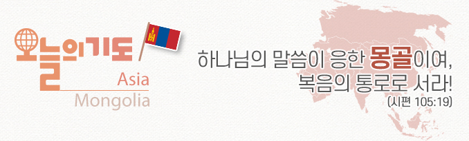30년 전에 적은 무리로 시작된 몽골 교회가 자라나 성장하게 하신 주님께 감사하자. 교회가 그리스도 안에 하나가 되어 더욱 간절히 기도하며 십자가 복음을 증거하여 몽골에 말씀이 응할 때까지 구원의 통로가 되도록 기도하자.