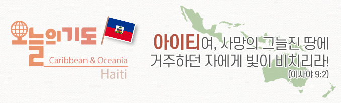 수백만 명의 아이티인들이 고국을 떠나 미국, 쿠바, 바하마 등으로 이주하여 최하층의 노동자로 살아가고 있다. 아이티의 영혼들이 옛적에는 고통과 멸시를 당하게 하셨지만, 이제는 평강의 왕이신 주님께서 구원하시길 기도하자. 그리하여 아이티가 복음으로 굳게 세워지도록 주님께서 영원히 정의와 공의로 다스리시고 영화롭게 변화시키도록 기도하자.