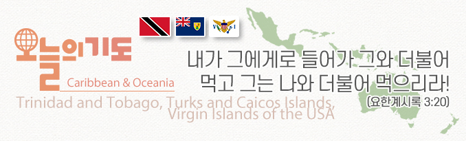 1. 터크스 케이커스 제도는 유명한 역외금융으로 조세회피처의 돈세탁과 불법 마약 밀매, 관광업의 성행으로 인한 방탕 등 여러 사회적 문제를 가지고 있다. 또한 경제 성장세에도 인구의 25%가 빈곤하게 살고 있다. 기독교 교인들 중 미등록자들이 26%나 되는 명목상 신자들이다. 그럼에도 소망이 있는 것은 복음주의자들이 인구의 32%이기에, 이들을 통해 교회가 미지근한 모습에서 벗어나도록 기도하자. 그리하여 정금과 같은 십자가 복음으로 부요하게 되고, 흰 옷을 사서 입어 벌거벗은 수치를 보이지 않게 하고, 안약을 사서 눈에 발라 하나님 나라를 보는 부흥이 임하길 기도하자.